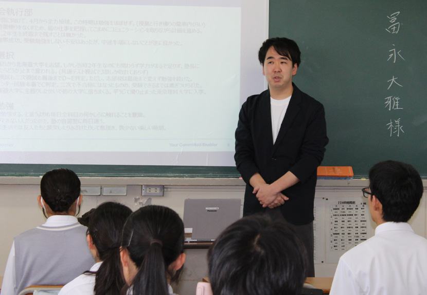 社会人として活躍する8名のOB、OGの皆様に、これから進路を選択していく1年生の学生達に向け、各クラスのHRに登壇いただきました。働く事の意義や仕事を通した人生観等、自身の経験やエピソードを交えながら熱弁を振う姿に、子供達は自分の将来像を考えるヒントが得られたのではないでしょうか?